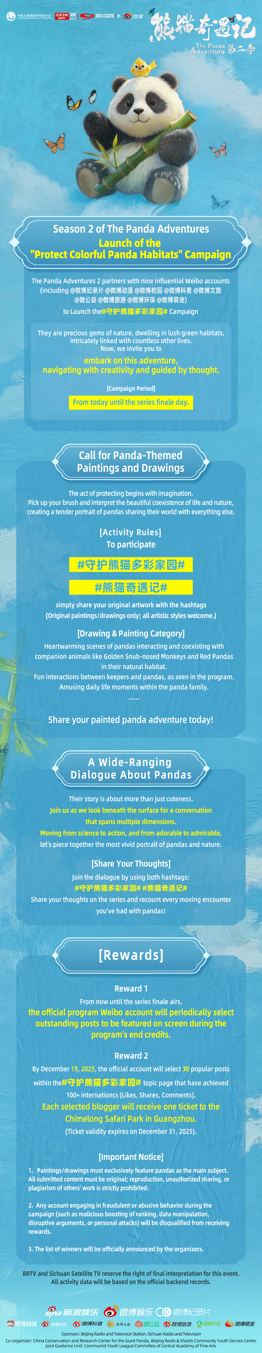 Jusqu’à la fin de la diffusion de la saison 2, publiez simplement sur les réseaux sociaux vos créations originales (dessins ou peintures) de scènes où le panda géant interagit avec les autres espèces de son habitat naturel avec les deux hashtags #守护熊猫多彩家园# (#ProtectingPandas'ColorfulHomeland) et #熊猫奇遇记2# (#PandaAdventure2) pour participer. Consultez l’image complète ci-dessous pour connaître le règlement détaillé. Vos œuvres d'art seront republiées sur les réseaux sociaux et les meilleures gagneront des billets d'entrée pour le parc de Chimelong à Guangzhou.