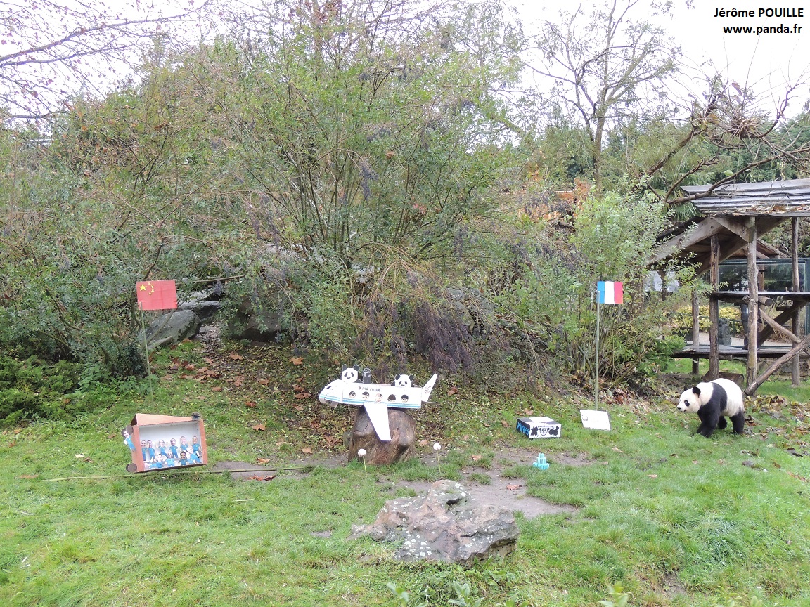 Hier dimanche 23 novembre était organisé un dernier goûter en public pour les stars de Beauval. Un peu avant 15 heures, l'équipe de soigneurs a installé dans les deux enclos extérieurs des enrichissements en clin d'œil au voyage à venir vers la Chine pour les deux pandas. Ils ont utilisé des cartons pour fabriquer une valise avec les photos de toute la team de soigneurs (uniquement pour Yuan Zi), des avions (celui de Yuan Zi était aux couleurs d'Air China, et celui de Huan Huan était neutre), des drapeaux français et chinois, des passeports, des boîtes et des gâteaux glacés.