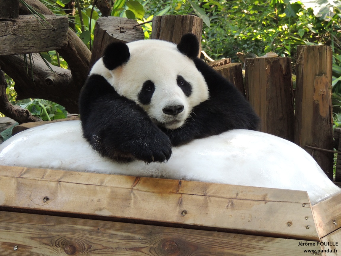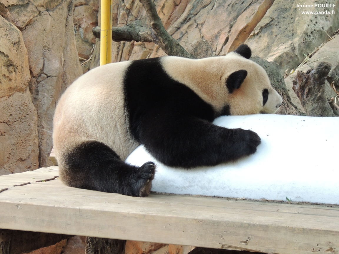 Qin Qin le 19 octobre 2025 ; on peut voir qu'il utilise le « lit de glace » dont tous les pandas de Chimelong disposent pour se rafraîchir. Ce dispositif a été spécialement conçu pour le parc et est maintenu à température constante 24 heures sur 24 alimenté par électricité - © Jérôme POUILLE