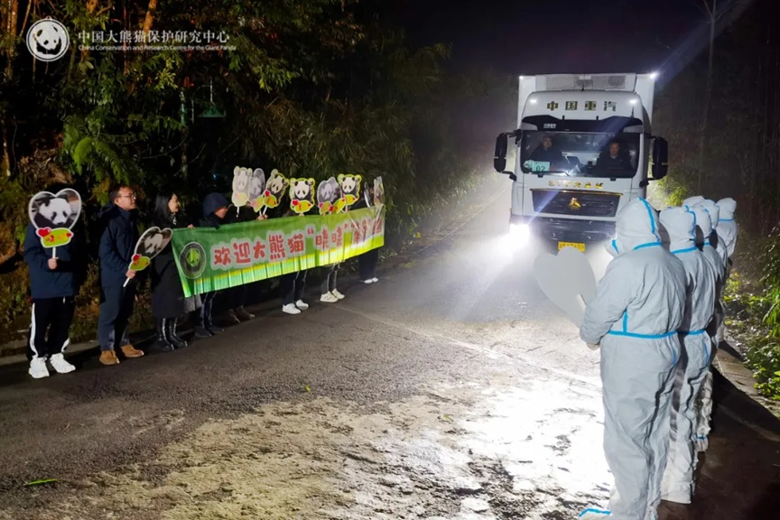 Les deux pandas sont arrivés le 28 janvier à 1h du matin heure chinoise à l'aéroport international de Chengdu Tianfu puis ont été transférés à la base de Ya'an Bifengxia du Centre Chinois de Recherches et de Conservation du Panda Géant (China Conservation and Research Centre for the Giant Panda) vers 6 heures où ils effectueront leur quarantaine.