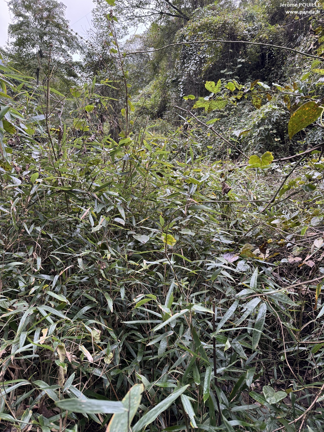 A Laohegou, les pandas géants vivent au-dessus de 2 000 m d'altitude. D'après mes guides, il y en aurait aujourd'hui 14 mais des échanges existent avec les réserves voisines. Les deux espèces de bambous que l'on trouve à Laohegou et qui sont mangées par le panda sont Fargesia rufa et Fargesia denudate.