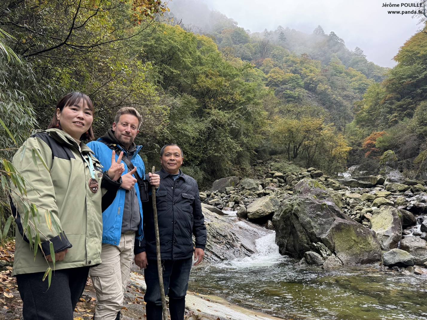 Avec les deux guides habilités de la réserve de Laohegou qui m'ont accompagné ce 27 octobre 2025, Mme Che Yan (车燕) et M. Fan Guiguo (范贵国) - © Jérôme POUILLE