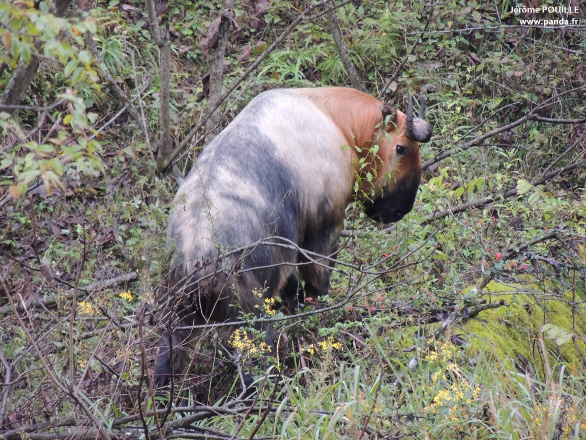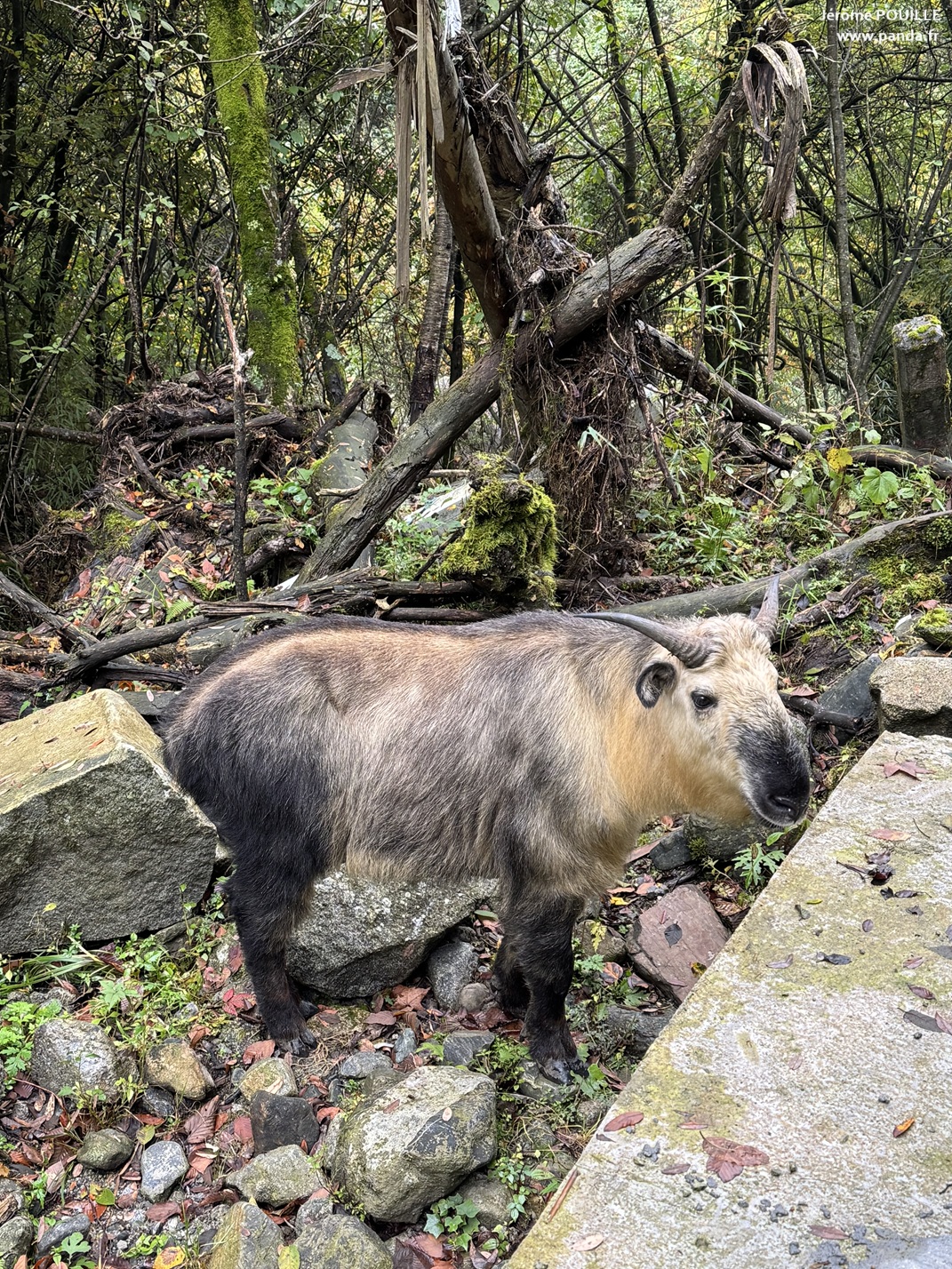 Petit focus sur ce jeune takin, âgé de 17 mois, et qui a été abandonné bébé par sa mère. Il a été secouru par le personnel de la réserve qui l'a élevé avant de le lâcher. Il reste encore très attiré par l'homme et rend visite aux promeneurs de passage vers là où il vit. Le personnel l'a nommé Wonderful - 27 octobre 2025 - © Jérôme POUILLE