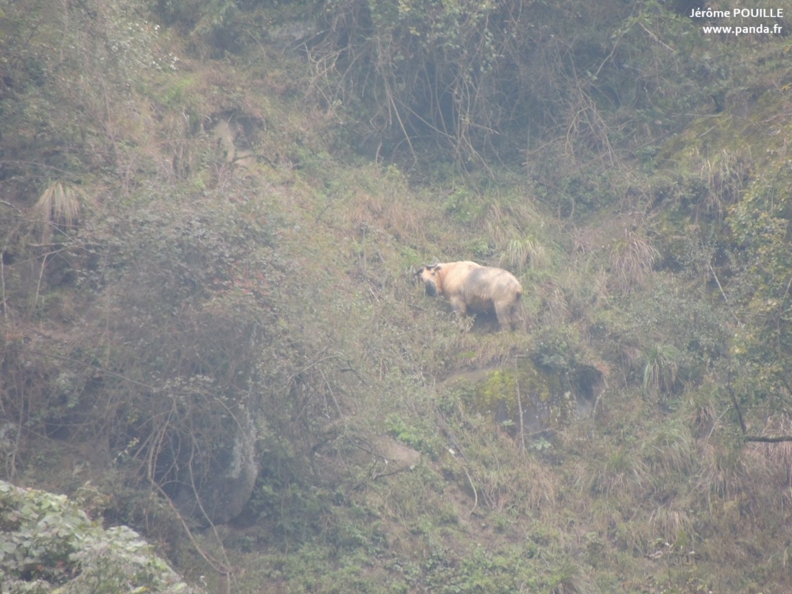 Le matin nous avons pu parcourir la totalité de la route depuis l'entrée, une partie avec le véhicule électrique et une partie à pied. Cette route serpente le long de la principale rivière du site, qui porte le même nom que la réserve. Nous avons pu observer plusieurs animaux qui peuplent la réserve, notamment plusieurs takins du Sichuan (Budorcas taxicolor tibetana), un élaphode (un cervidé) (Elaphodus cephalophus), deux sangliers (Sus scrofa ssp.), deux muntjacs de Reeve (Muntiacus reevesi), une femelle faisan doré (Chrysolophus pictus), plusieurs jeunes tragopans de Temminck (Tragopan temminckii).