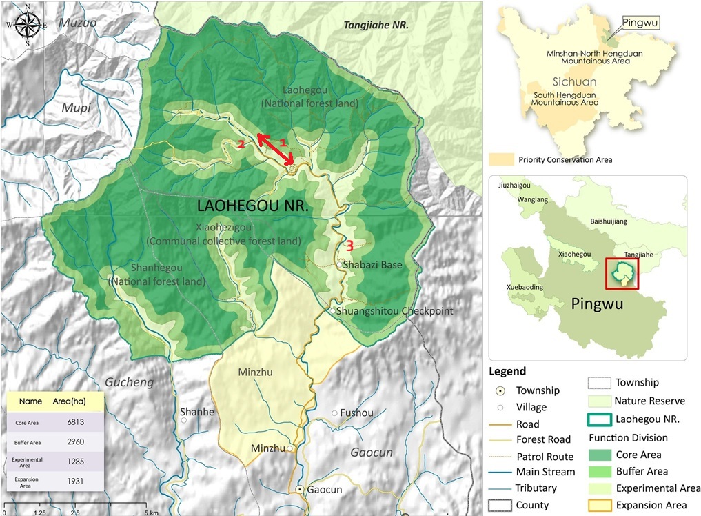 En 2013, le gouvernement du comté de Pingwu approuve le statut de réserve naturelle de niveau comté pour Laohegou. Cette réserve protège un mixte d'anciennes forêts exploitées, de terres collectives gérées par les communautés locales et de forêts originelles. En 2014, la « Sichuan Nature Conservation Foundation » établit le Centre de conservation de la nature de Laohegou (Laohegou nature conservation center).