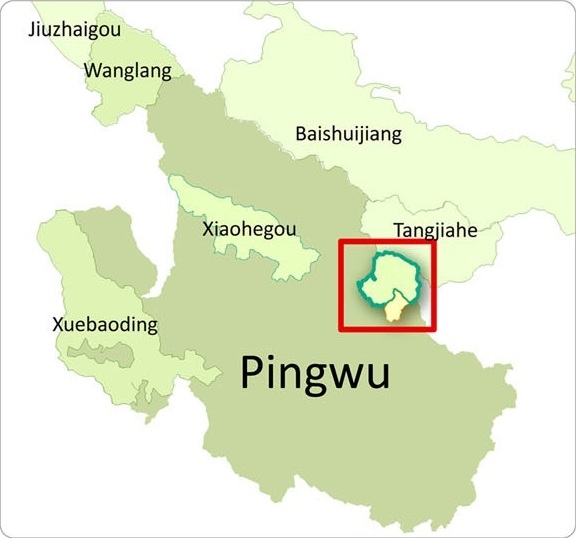 Le comté de Pingwu et ses réserves naturelles : Xuebaoding, Wanglang, Xiaohegou et Laohegou (cette dernière est détourée de vert, et son extension de 2020 détourée de jaune) et quelques autres réserves naturelles importantes dans les comtés voisins (la réserve naturelle de Tangjiahe dans le comté de Qingchuan dans la province du Sichuan, la réserve naturelle de Baishuijiang dans les comtés de Wenxian et Wudu dans la province du Gansu, et la réserve naturelle de Jiuzhaigou dans le comté du même nom dans la province du Sichuan).
