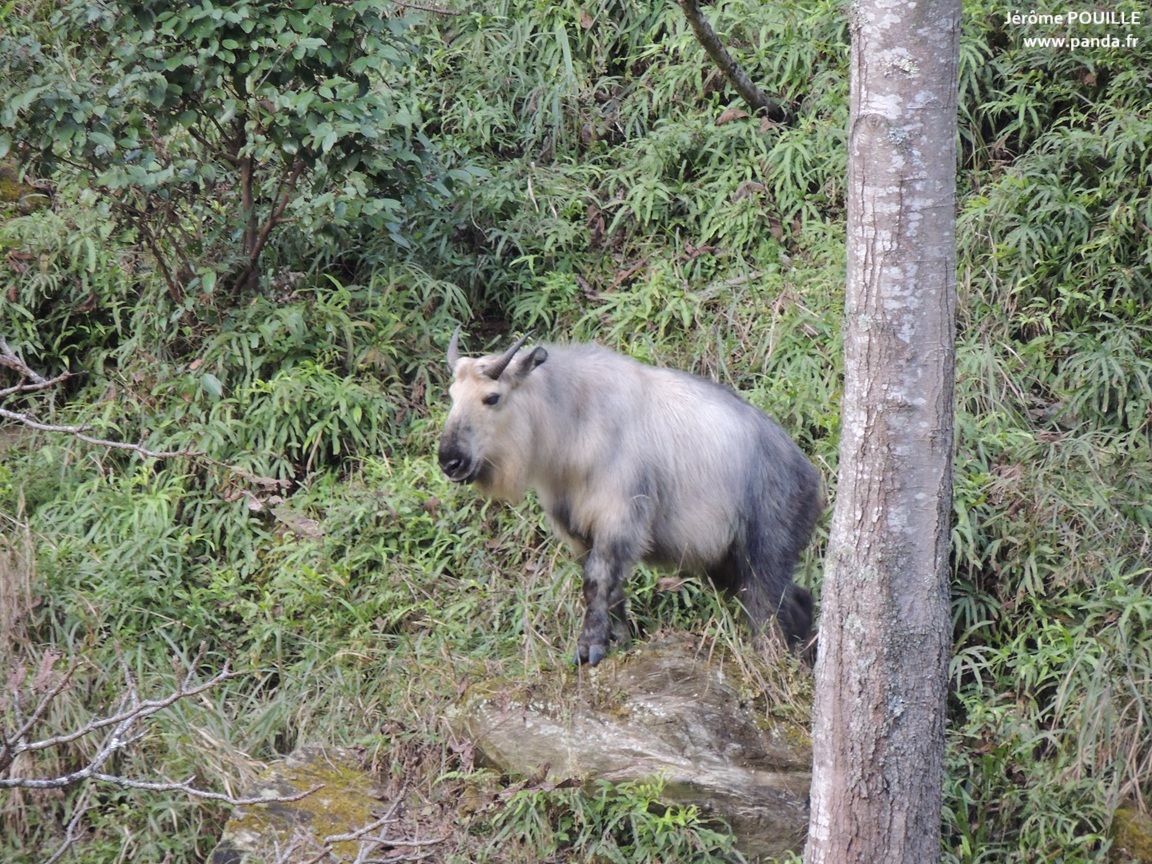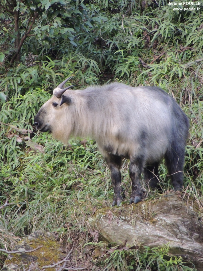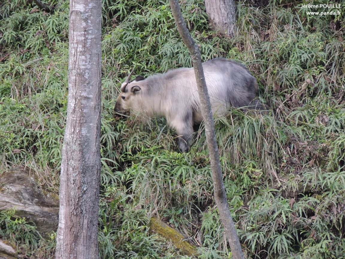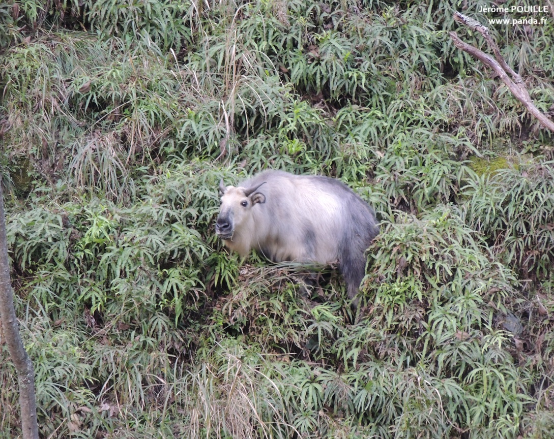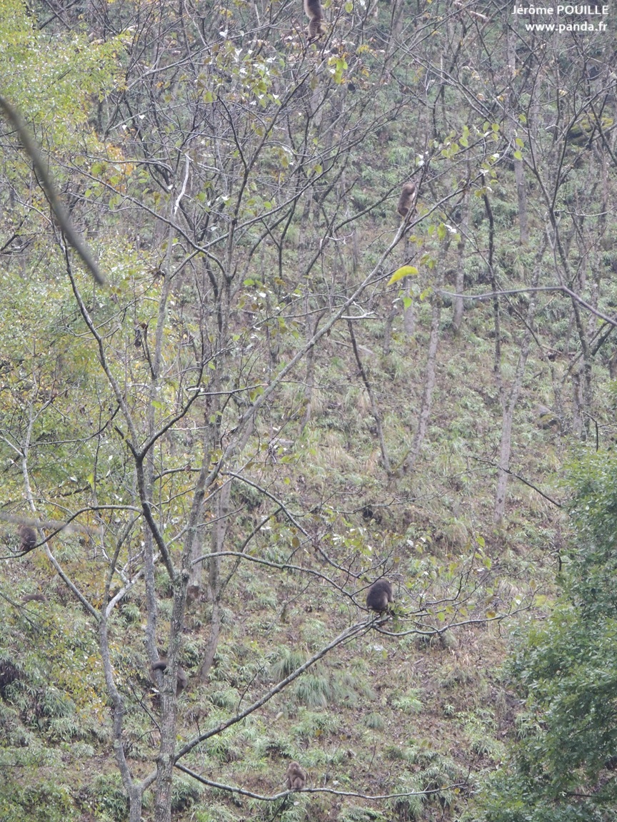 La route entre la station de Baiguoping (白果坪 ; la station la plus proche de l'entrée de la réserve) et le centre d'échange scientifique de Maoxiangba (毛香坝 ; c'est dans ce centre que se situent les hébergements et le siège de la réserve) longe la rivière Beilugou (北路沟) et il est fréquent d'y observer des animaux l'un ou l'autre des versants. Ci-dessus plusieurs takins du Sichuan (Budorcas taxicolor tibetana) observés le 29 octobre - © Jérôme POUILLE