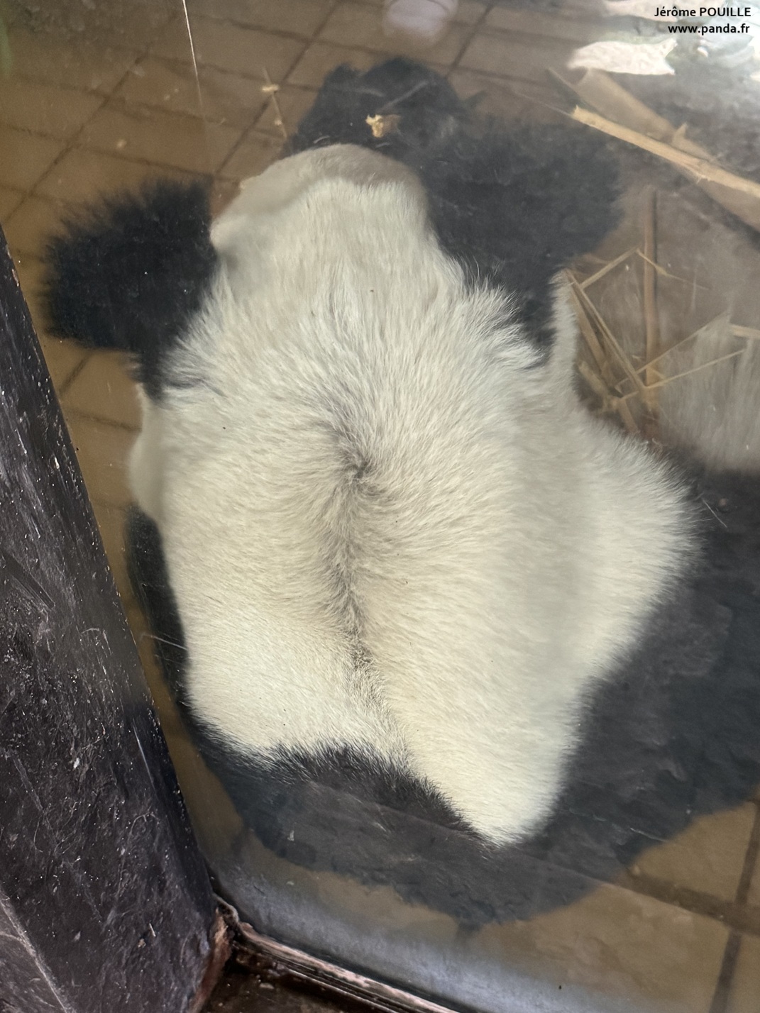 Xin Xin dans un de ses deux enclos intérieurs (celui noté IN 5 sur le schéma) le 14 novembre 2025. Durant mes visites je l'ai vue à plusieurs reprises s'adosser contre la vitre de ses enclos intérieurs pour manger - © Jérôme POUILLE
