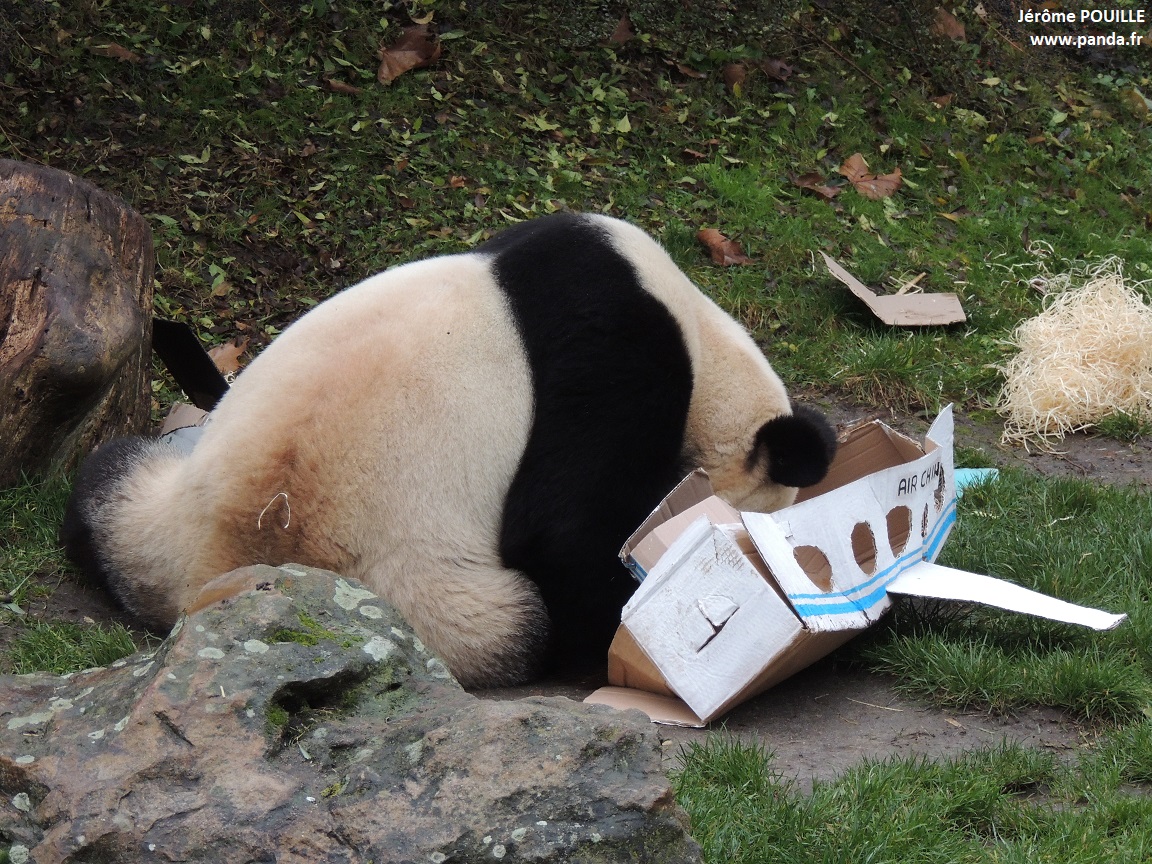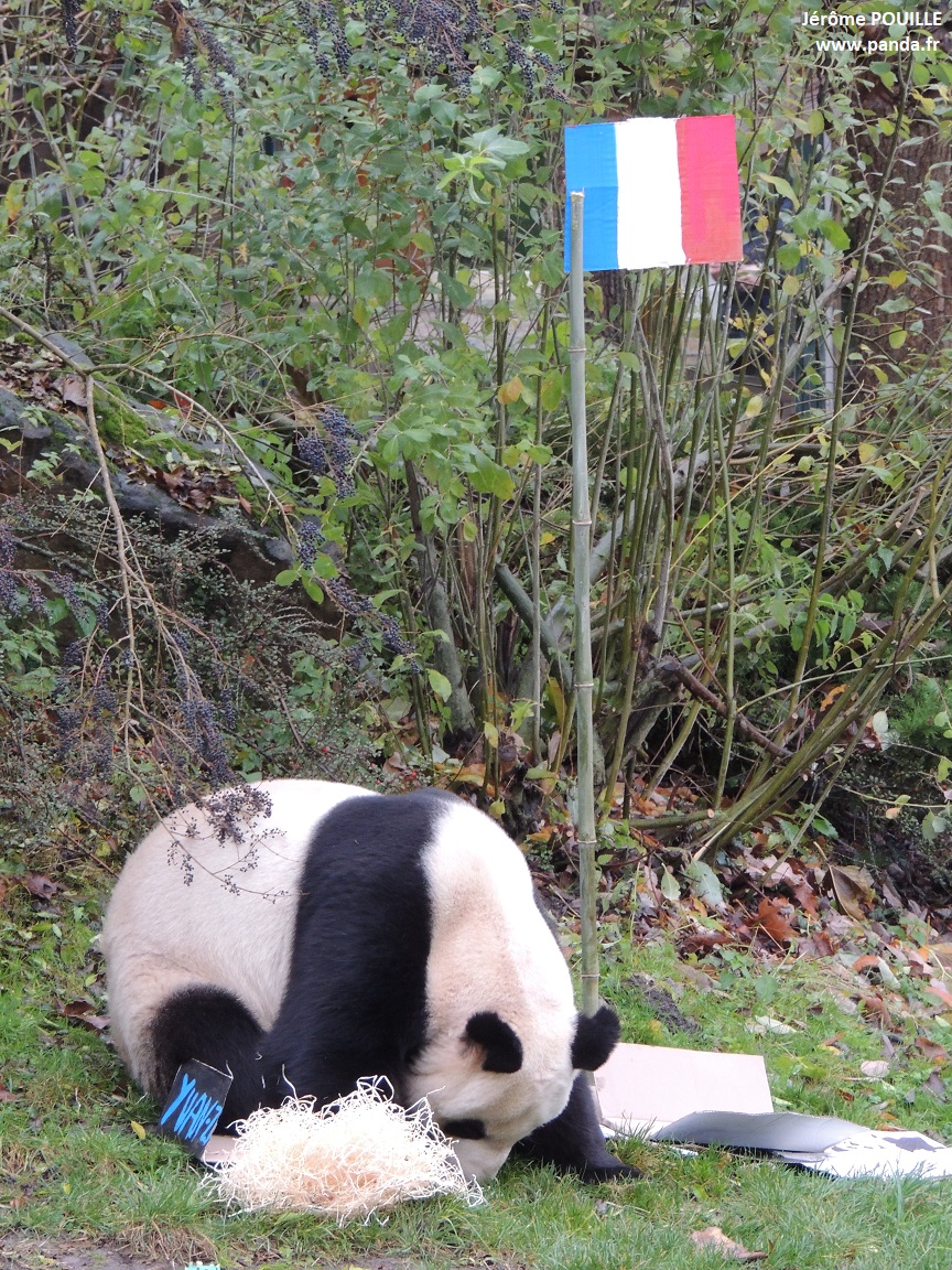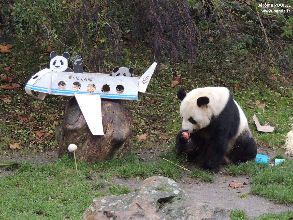 Hier dimanche 23 novembre était organisé un dernier goûter en public pour les stars de Beauval. Un peu avant 15 heures, l'équipe de soigneurs a installé dans les deux enclos extérieurs des enrichissements en clin d'œil au voyage à venir vers la Chine pour les deux pandas. Ils ont utilisé des cartons pour fabriquer une valise avec les photos de toute la team de soigneurs (uniquement pour Yuan Zi), des avions (celui de Yuan Zi était aux couleurs d'Air China, et celui de Huan Huan était neutre), des drapeaux français et chinois, des passeports, des boîtes et des gâteaux glacés.