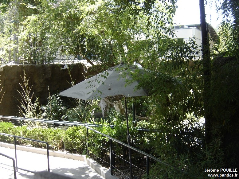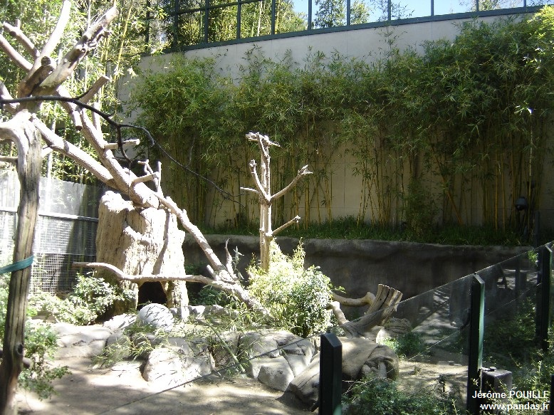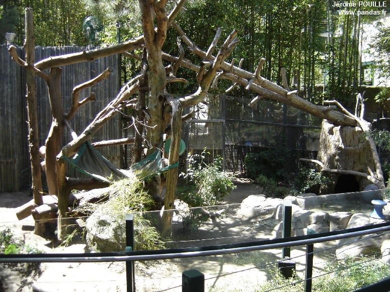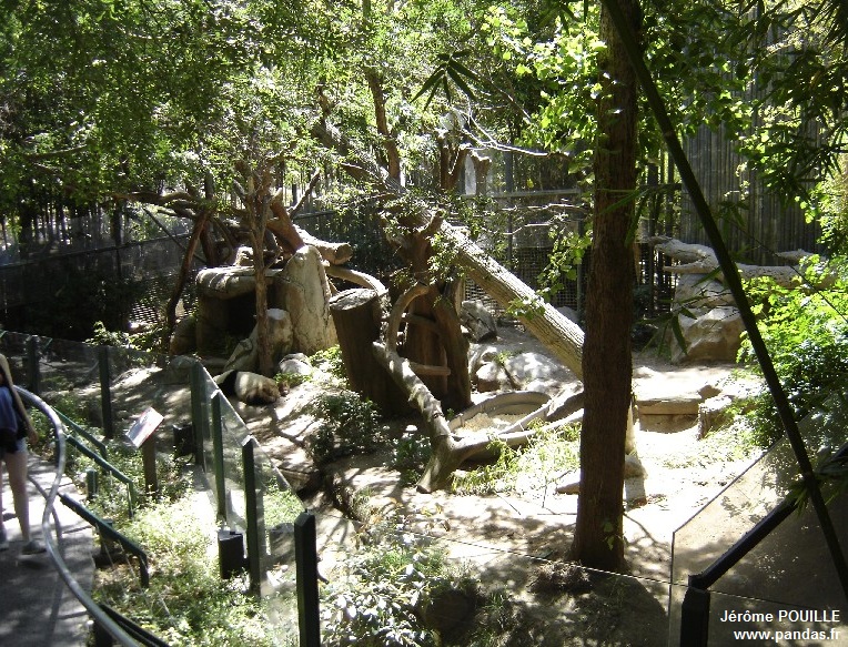 Les deux enclos extérieurs accessibles au public sont relativement petits au regard de ceux que j'ai pu voir à Vienne, Madrid ou encore Beauval. Ils sont pauvres en verdure au sol même si des arbres fournissent de l'ombre et les pandas n'ont que peu d'alternatives que d'être en contact visuel avec la foule. Des objets d'enrichissement et des troncs d'arbres permettent cependant aux deux pandas de grimper et de s'occuper. Des trappes relient les deux enclos, elles jouent un rôle essentielle à la saison des amours pour que Bai Yun et Gao Gao s'habituent l'un à l'autre et ce pour limiter les agressions au moment de l'introduction, lorsque les portes s'ouvrent.