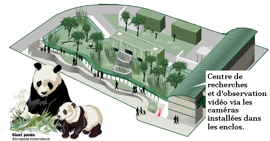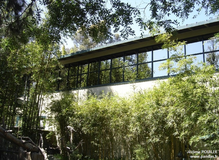 Les espaces dédiés aux pandas comportent ainsi deux enclos extérieurs visibles du public, un bâtiment juste derrière ces deux enclos qui sert d'abris intérieurs pour les pandas, un bâtiment servant de station de recherche, un enclos extérieur à proximité de la boutique de souvenirs qui est difficilement visible par le public, et des enclos extérieurs en retrait non accessibles au public.