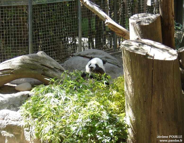 Généralement, Bai Yun est en permanence visible et occupe l'enclos de gauche ; celui de droite recevant par alternance Yun Zi ou Gao Gao. Le jour de ma visite, Bai Yun ayant été isolée en prévision d'une grossesse potentielle, Gao Gao occupait l'enclos de Bai Yun (celui de gauche) tandis que Yun Zi se trouvait dans celui de droite.