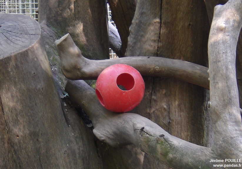 Un objet d'enrichissement placé dans l'enclos de Gao Gao, une balle percée dans laquelle est disposée de la nourriture