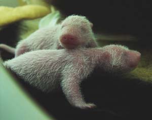 Guo Guo, âgée de 7 ans et mère pour la première fois, a donné naissance à des jumeaux vendredi 8 juillet 2005 à la réserve naturelle de Wolong en Chine au sud-ouest de la province du Sichuan.