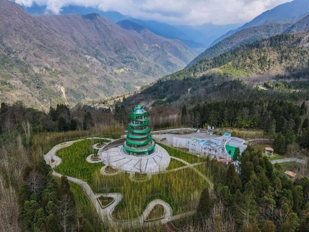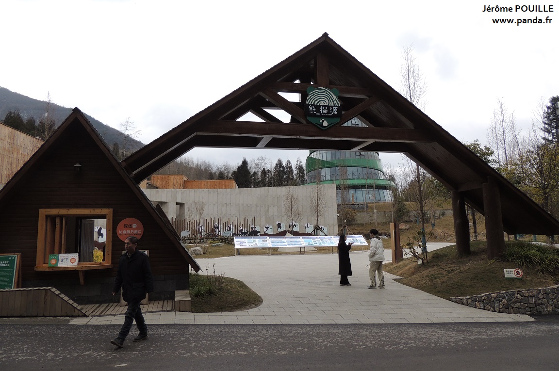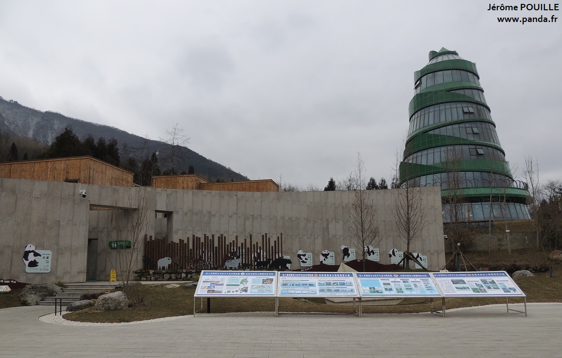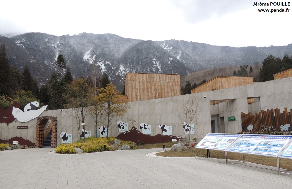 Entrée et parvis du centre Origin of panda. Le décor de ce centre est spectaculaire, il est entouré des montagnes où vit le panda à l'état sauvage - 7 mars 2024 - © Jérôme POUILLE