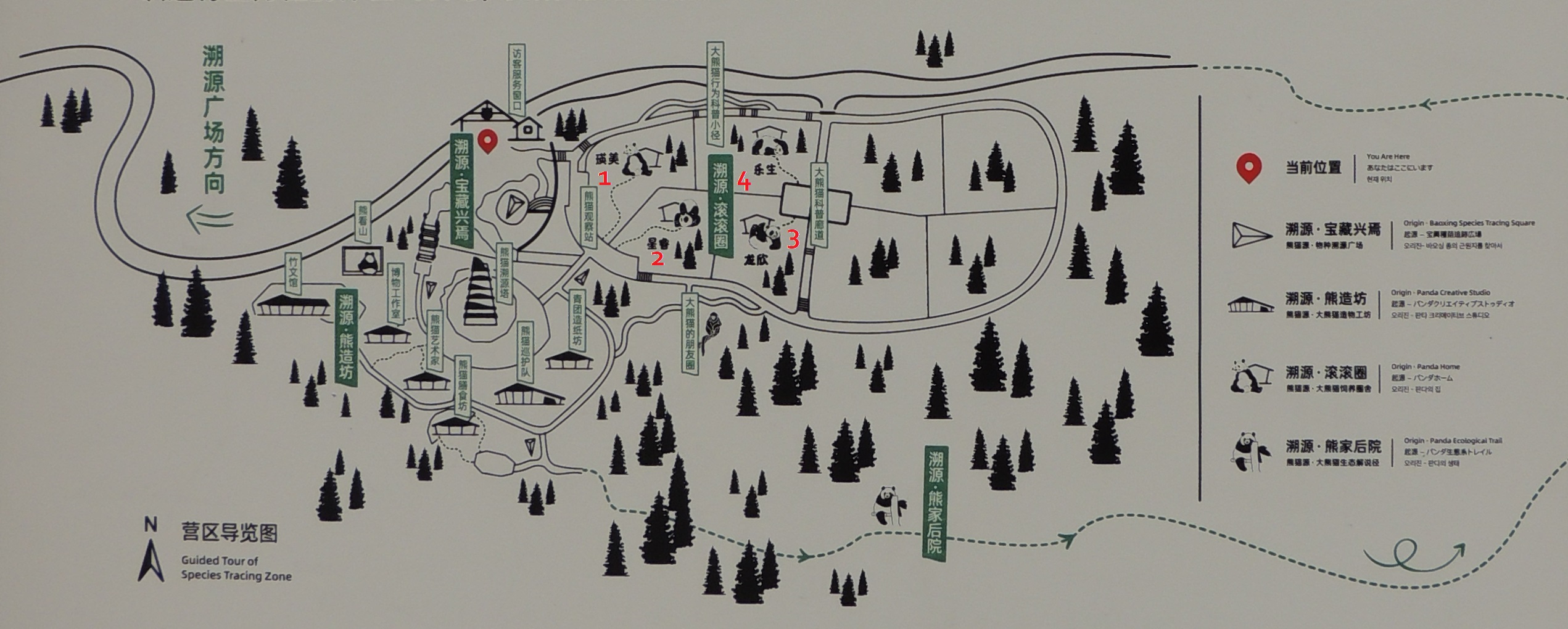 Plan du centre Origin of panda. Les enclos numérotés de 1 à 4 sont occupés respectivement par Ying Mei (enclos 1), Xing Rui (enclos 2), Long Xin (enclos 3) et Le Sheng (enclos 4) - © Jérôme POUILLE