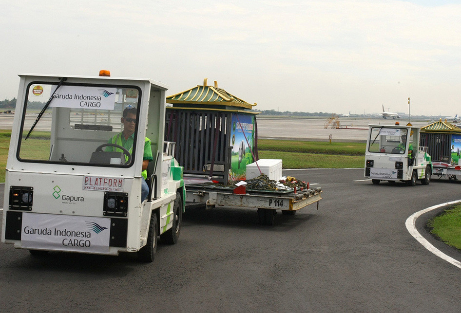 Le vol GA887, affrété spécialement par la branche cargo de la compagnie aérienne Garuda Indonesia pour le transfert des deux animaux, a quitté l'aéroport international de Chengdu Shuangliu, en Chine, à 4h13 du matin heure locale le jeudi 28 septembre pour arriver 5h47 plus tard, à 9 heures précises, à l'aéroport international de Soekarno-Hatta à Jakarta, en Indonésie.