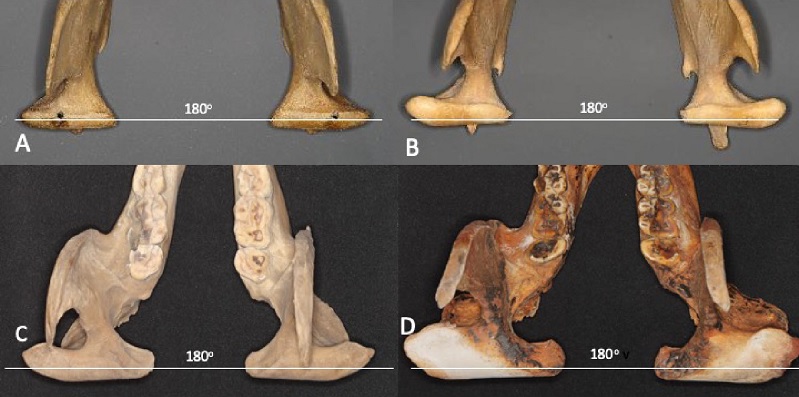 Les têtes condyliennes du panda géant (C : jeune panda, D : panda âgé) sont élargies à leur extrémité latérale,