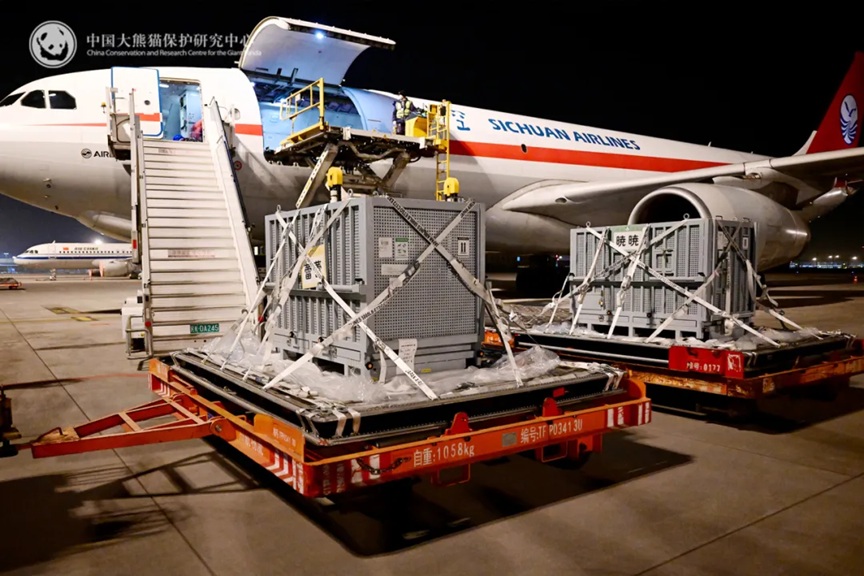 Les deux pandas sont arrivés le 28 janvier à 1h du matin heure chinoise à l'aéroport international de Chengdu Tianfu puis ont été transférés à la base de Ya'an Bifengxia du Centre Chinois de Recherches et de Conservation du Panda Géant (China Conservation and Research Centre for the Giant Panda) vers 6 heures où ils effectueront leur quarantaine.