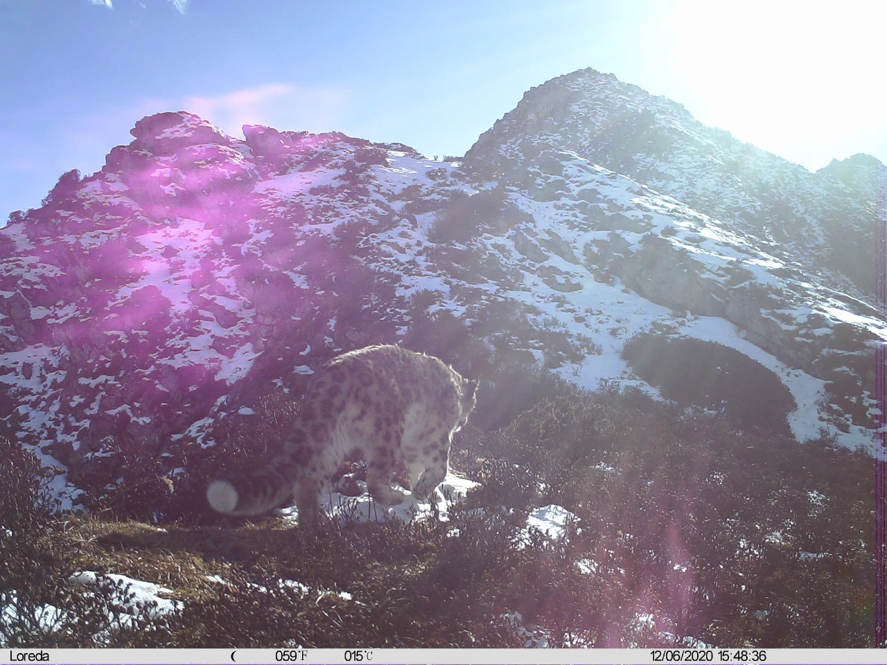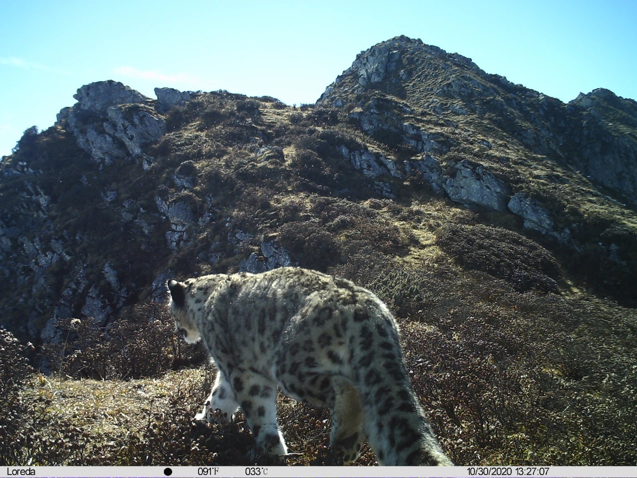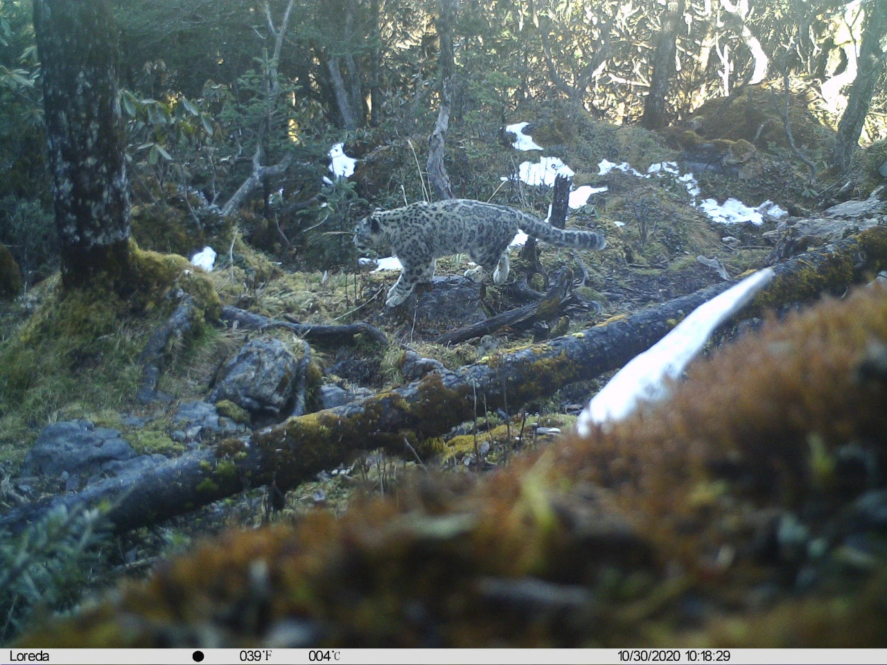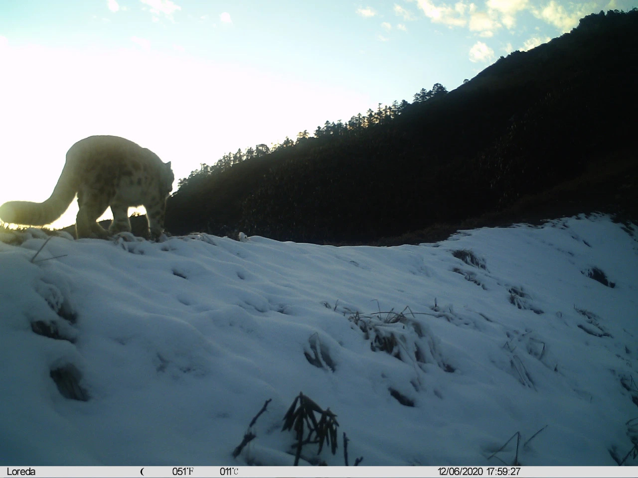Des panthères des neiges (Panthera uncia) photographiées les 30 octobre et 6 décembre 2020 respectivement, dans la réserve naturelle d'Anzihe