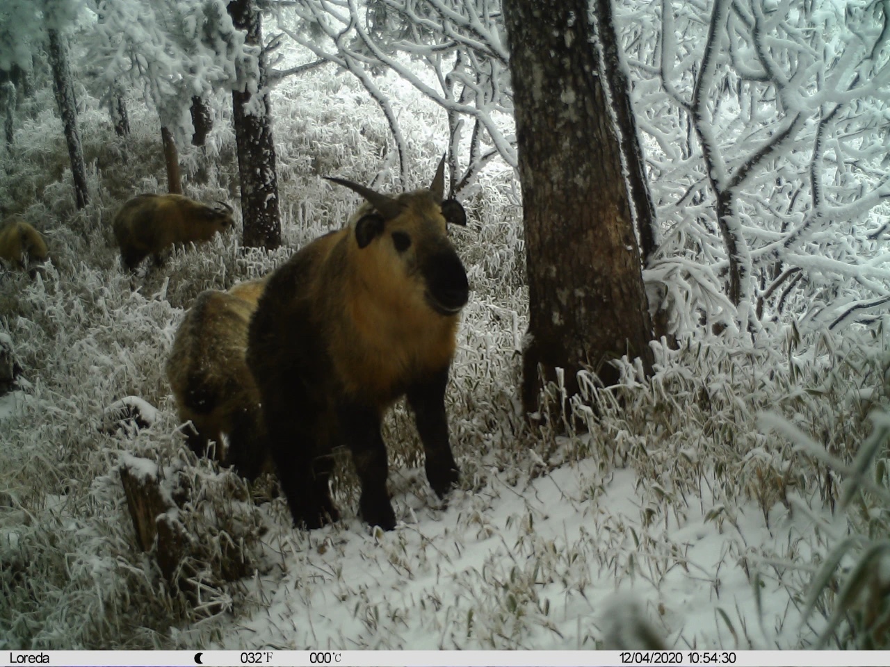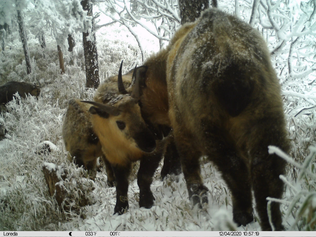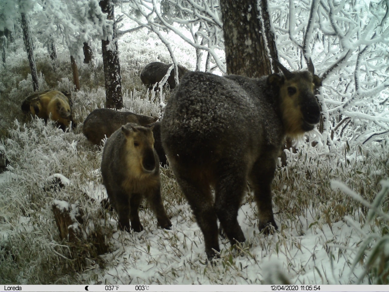 Des takins du Sichuan (Budorcas taxicolor tibetana) photographiés le 4 décembre 2020 dans la réserve naturelle d'Anzihe