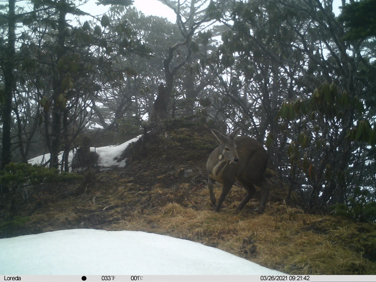 Un chevrotain porte-musc nain (Moschus berezovskii) photographié le 26 mars 2021 dans la réserve naturelle d'Anzihe