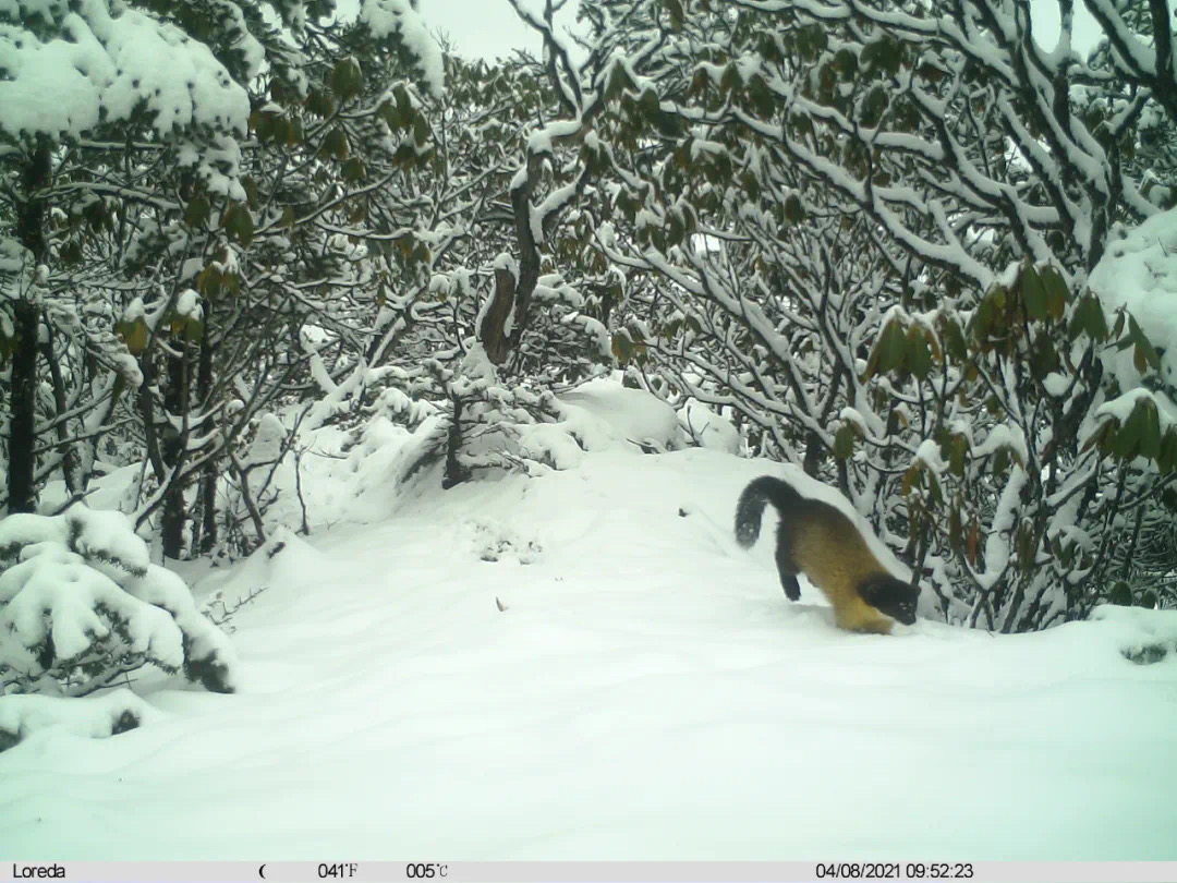 Une martre à gorge jaune (Martes flavigula) photographiée le 8 avril 2021 dans la réserve naturelle d'Anzihe