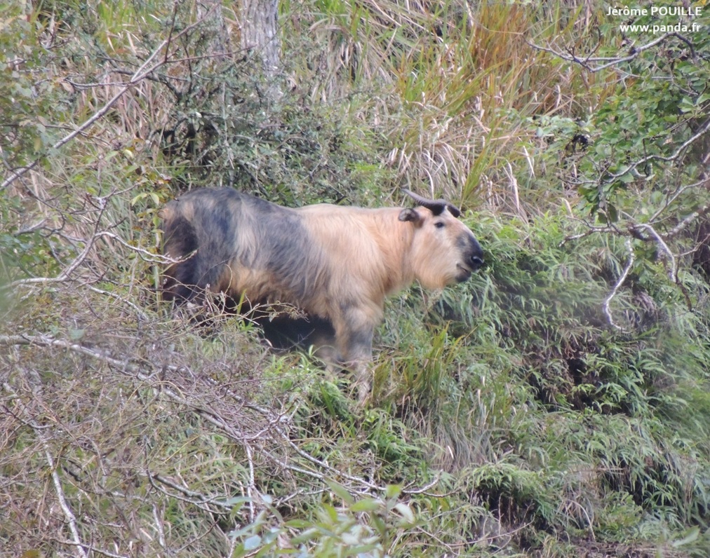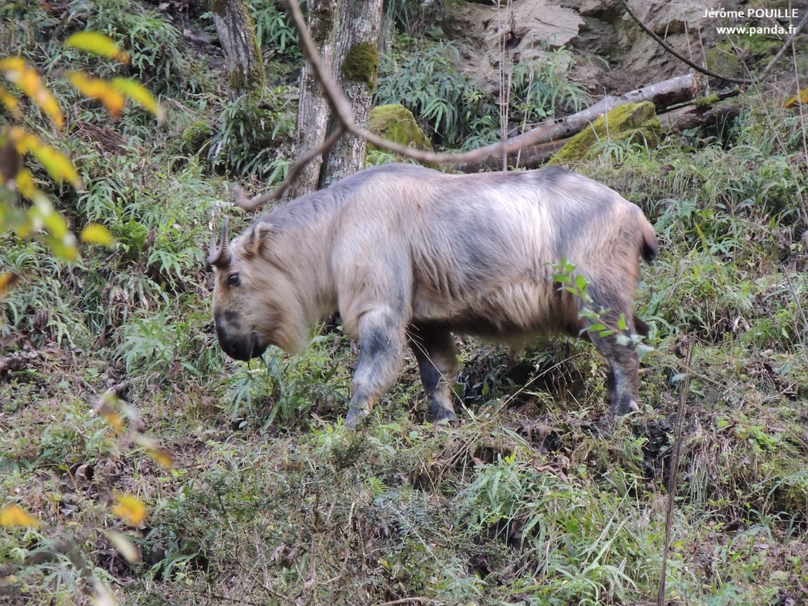 La route entre la station de Baiguoping (白果坪 ; la station la plus proche de l'entrée de la réserve) et le centre d'échange scientifique de Maoxiangba (毛香坝 ; c'est dans ce centre que se situent les hébergements et le siège de la réserve) longe la rivière Beilugou (北路沟) et il est fréquent d'y observer des animaux l'un ou l'autre des versants. Ci-dessus plusieurs takins du Sichuan (Budorcas taxicolor tibetana) observés le 29 octobre - © Jérôme POUILLE