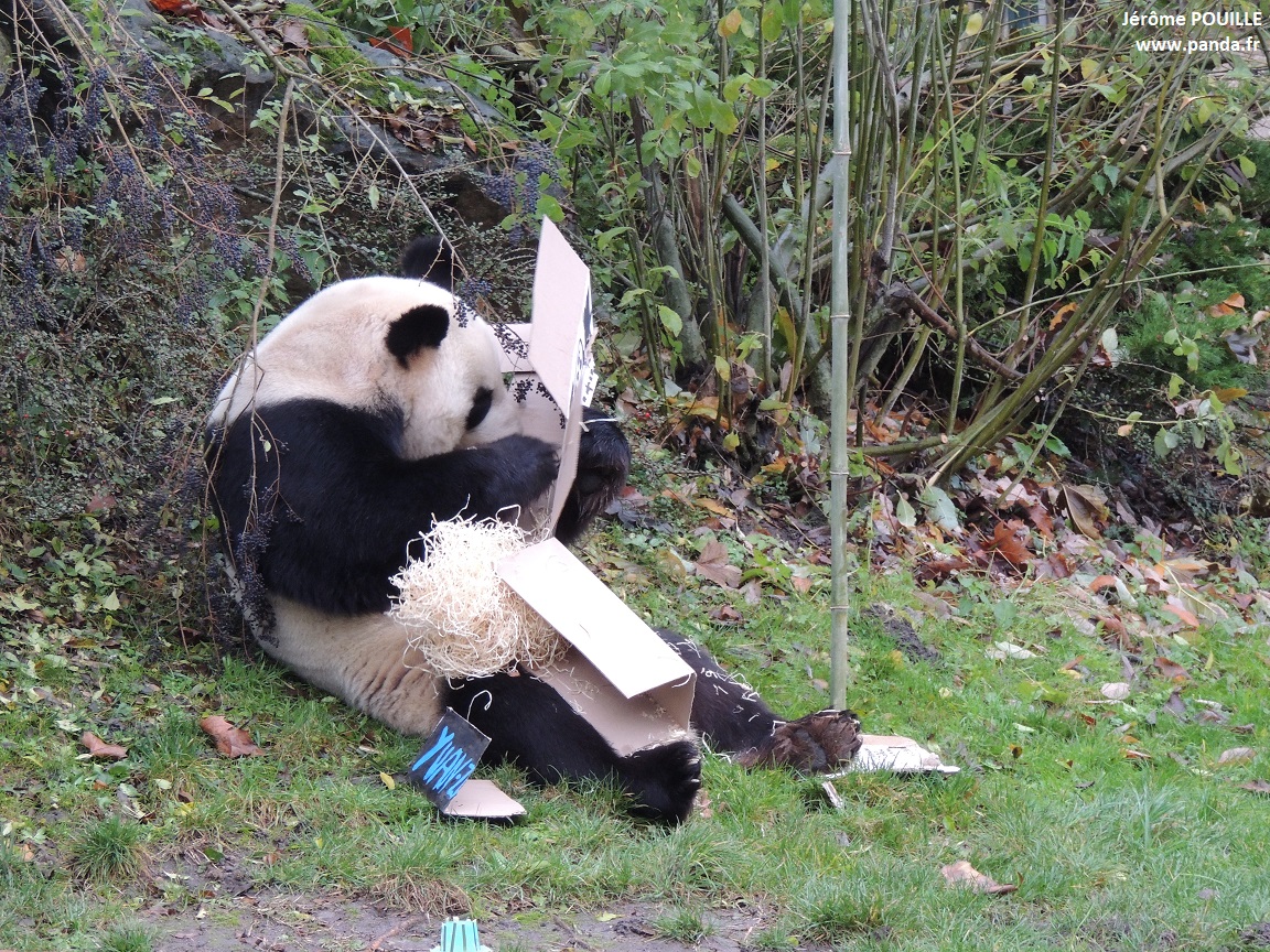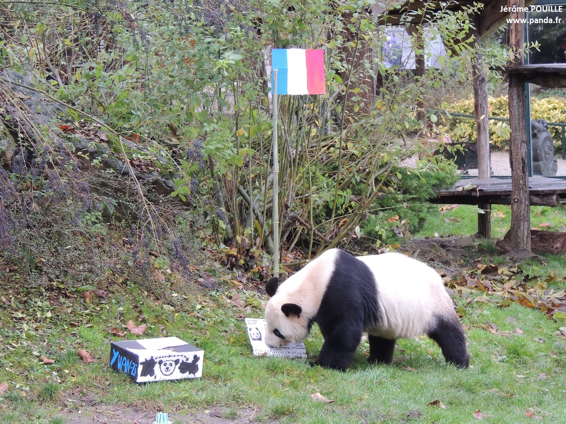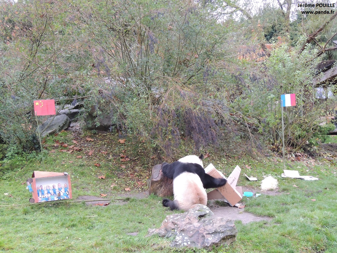 Hier dimanche 23 novembre était organisé un dernier goûter en public pour les stars de Beauval. Un peu avant 15 heures, l'équipe de soigneurs a installé dans les deux enclos extérieurs des enrichissements en clin d'œil au voyage à venir vers la Chine pour les deux pandas. Ils ont utilisé des cartons pour fabriquer une valise avec les photos de toute la team de soigneurs (uniquement pour Yuan Zi), des avions (celui de Yuan Zi était aux couleurs d'Air China, et celui de Huan Huan était neutre), des drapeaux français et chinois, des passeports, des boîtes et des gâteaux glacés.