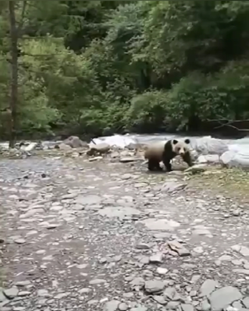 Le mardi 16 juin dernier, Zhang Zhijun (张志军), un habitant du village de Garicun (嘎日村), rattaché à la commune de Qiaoqixiang (硗碛乡) dans le comté de Baoxing (province du Sichuan) a aperçu un panda sauvage près d'une rivière dans le secteur de Caopenggou (草棚沟) alors que le villageois se trouvait en moto sur une petite route de montagne. L'animal a observé cet intrus humain et a fini par traverser la rivière. Les grands pandas savent nager et traverser sans trop de difficulté des cours d'eau où le courant n'est pas trop important.
