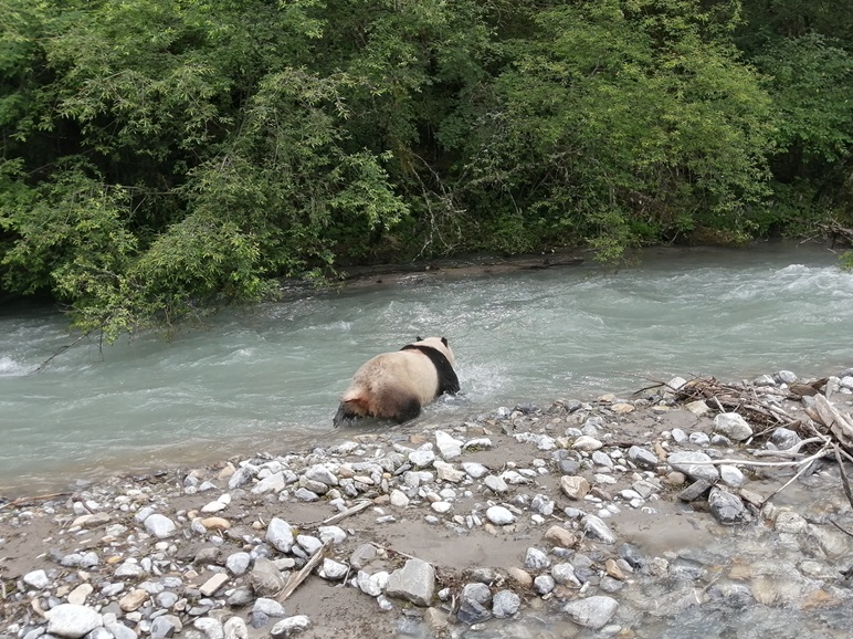Le vendredi 31 juillet dernier vers 16h20, le ranger Luo Chunping (罗春平) a aperçu un panda géant sauvage sur la route alors qu'il conduisait à proximité de la vallée d'Hulugou (葫芦沟) dans la réserve naturelle de Wanglang. L'animal a traversé la route puis s'est dirigé vers le cours d'eau de Xiaohegou (小河沟) en contrebas avant de le traverser et de rejoindre la forêt sur l'autre rive. Le garde a pu filmer la scène avec son téléphone portable.