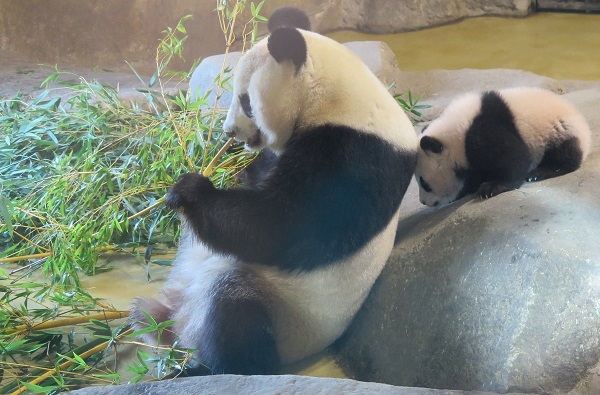 Rodeadas de la expectación de autoridades y medios de comunicación, madre y cría han realizado su primera salida a la pagoda exterior, tras cuatro meses y medio en los que la pequeña ha sido permanentemente amamantada por su madre Hua Zui Ba hasta convertirse en una cría fuerte que ya es capaz de sostenerse sobre sus patas delanteras y dar sus primeros pasos.