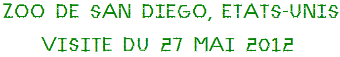J'ai visité le zoo de San Diego (San Diego Zoo) le dimanche 27 mai 2012 et une amie habitant San Diego et fidèle du zoo et de ses pandas, Mollie, s'est joint à moi pour enrichir cette visite. Je la remercie chaleureusement pour sa gentillesse, son accueil sympathique et pour toutes les informations qu'elle a partagé avec moi. Mollie est membre tout comme moi du réseau international Pandas Unlimited et elle publie fréquemment les photos qu'elle prend au zoo de San Diego sur l'hébergeur Flickr.