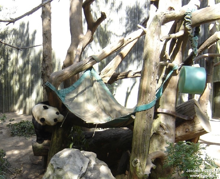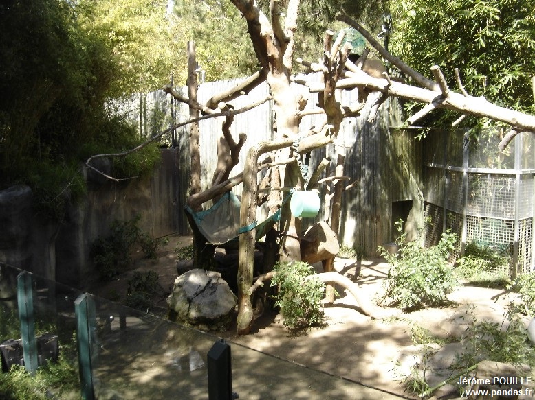 Les deux enclos extérieurs accessibles au public sont relativement petits au regard de ceux que j'ai pu voir à Vienne, Madrid ou encore Beauval. Ils sont pauvres en verdure au sol même si des arbres fournissent de l'ombre et les pandas n'ont que peu d'alternatives que d'être en contact visuel avec la foule. Des objets d'enrichissement et des troncs d'arbres permettent cependant aux deux pandas de grimper et de s'occuper. Des trappes relient les deux enclos, elles jouent un rôle essentielle à la saison des amours pour que Bai Yun et Gao Gao s'habituent l'un à l'autre et ce pour limiter les agressions au moment de l'introduction, lorsque les portes s'ouvrent.